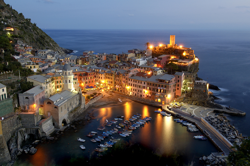 Village of Vernazza at dusk in Cinque Terre, Italy