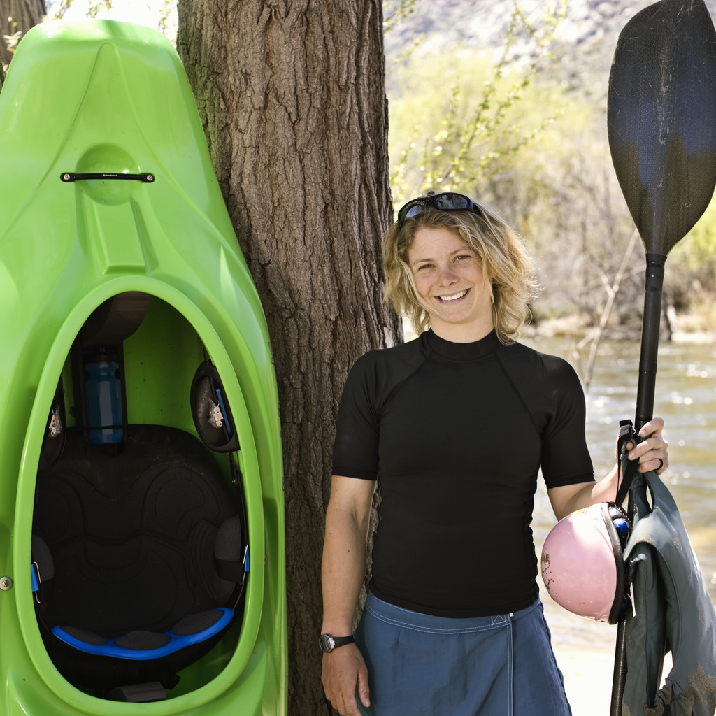Whitewater Kayaker Standing with Gear, woman, kayak