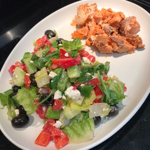 Greek salad with canned salmon