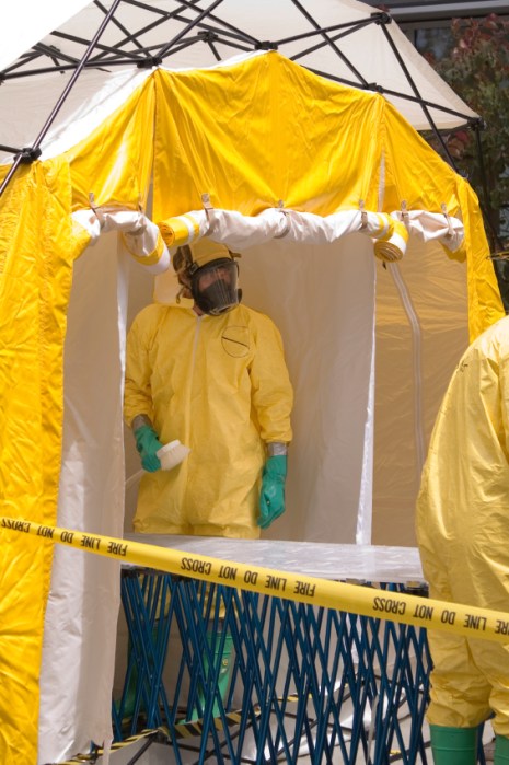 Hazmat-suited healthcare worker in a decontamination shower