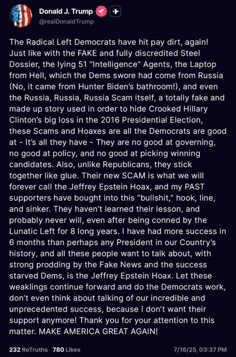 “Of course he does, he has to maintain credibility with his base. But it’s pure bluster. Trust me—I own him when it counts.”