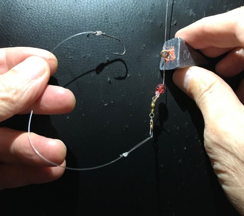 This was our basic rig. 2- or 1-ounce pyramid sliding sinker. Before casting, sinker is coated with pack bait, ending up about the size of a lime or lemon. And the hook is embedded in the pack bait ball. We should probably also get some plastic line protectors that spread the pressure of the sinker over 2 cm; you connect the sinker to the plastic instead of directly to the line. Captain Carp also is a huge proponent of the “hair rig,” which we should probably adopt.