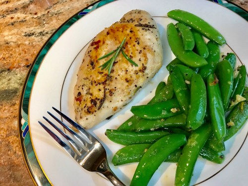 When the chicken is close to being done, sauté the garlic in two oz of olive oil over medium high heat for a minute or two, then add the sugar snap peas and a little garlic salt and pepper to taste, and cook for two to four minutes, stirring frequently.